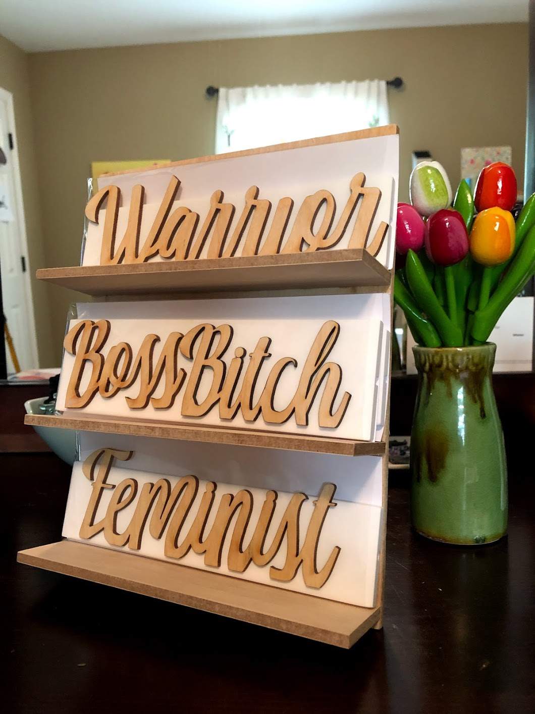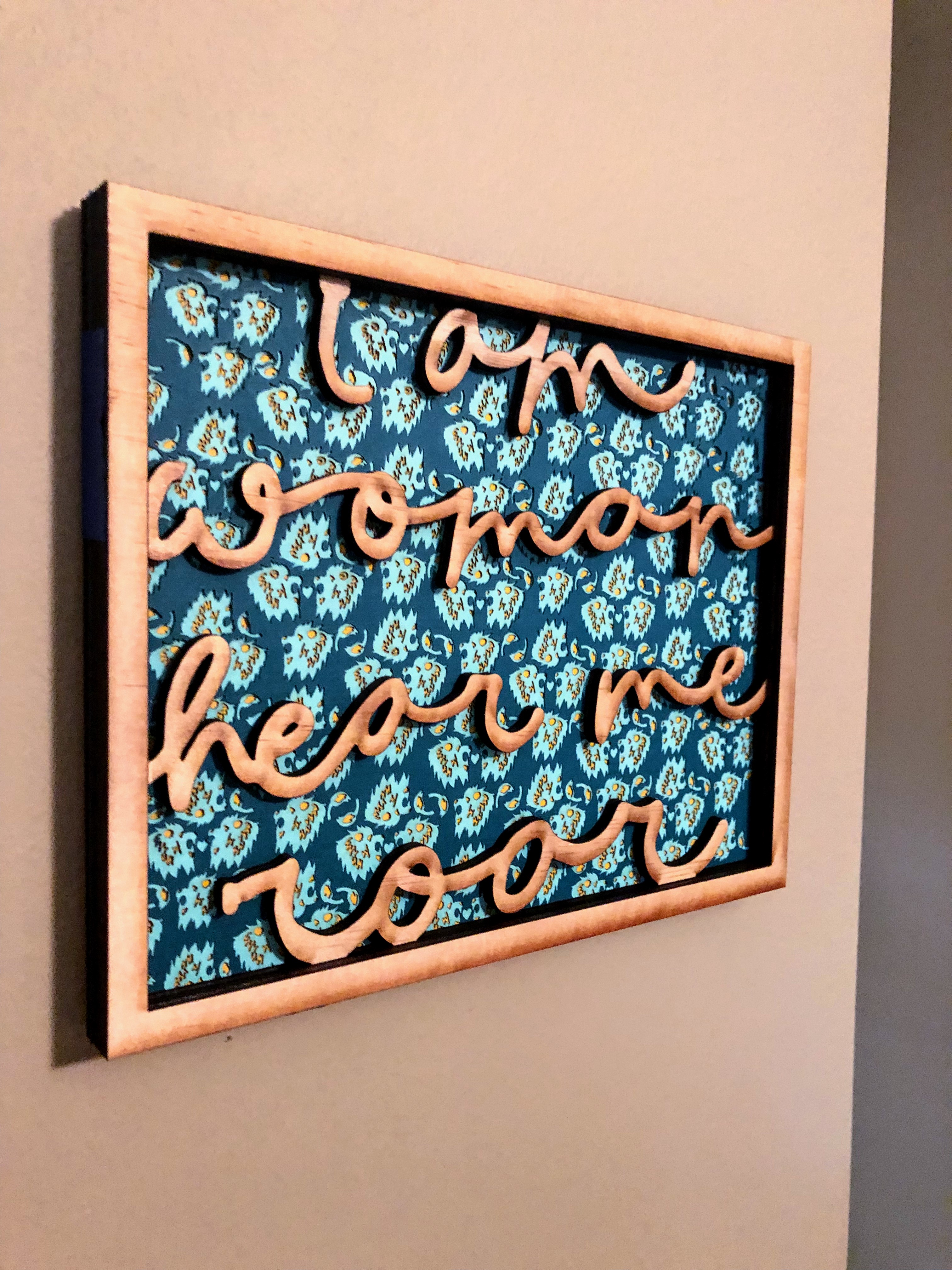 ‘I Am Woman Hear Me Roar’ cut out from plywood with paper lion background